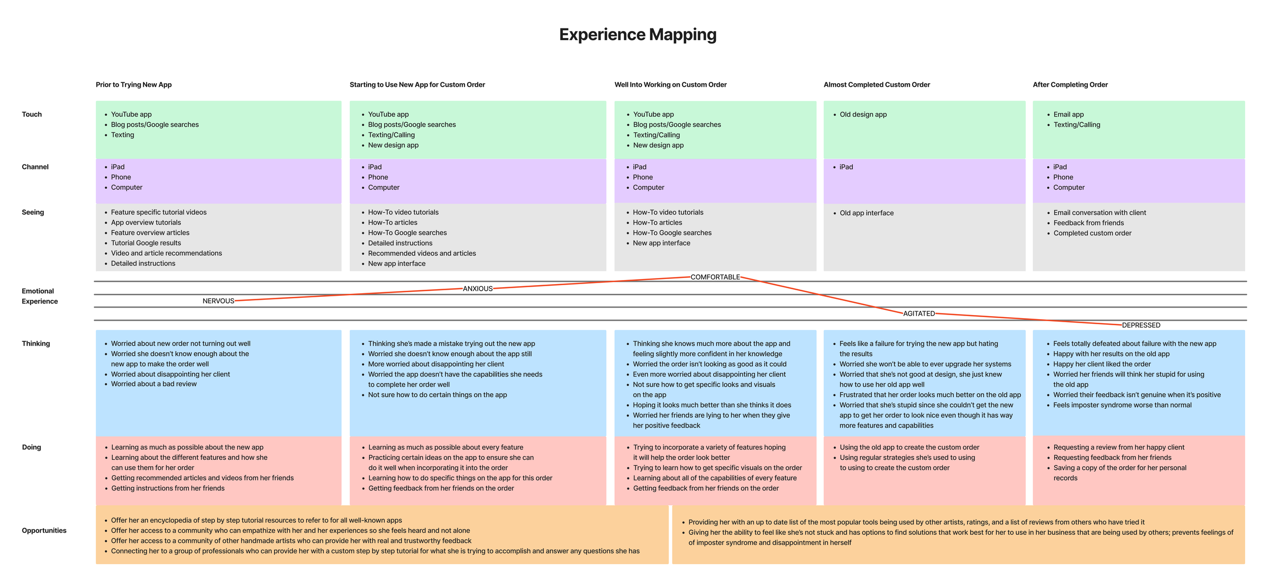 The experience Map was a fantastic way for me to get inside the mind of my persona and understand their behaviour and thoughts at any given time.