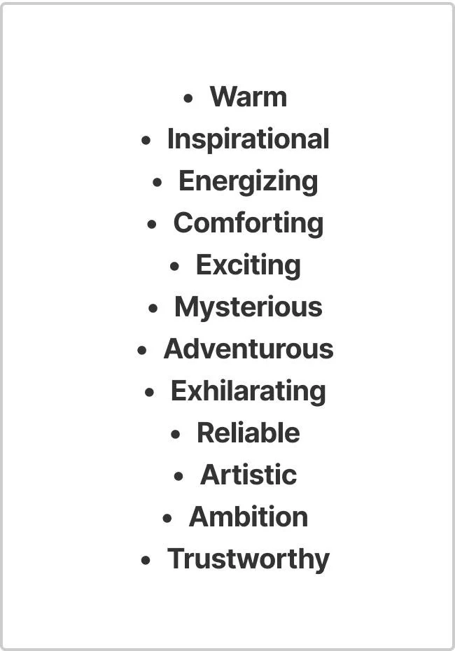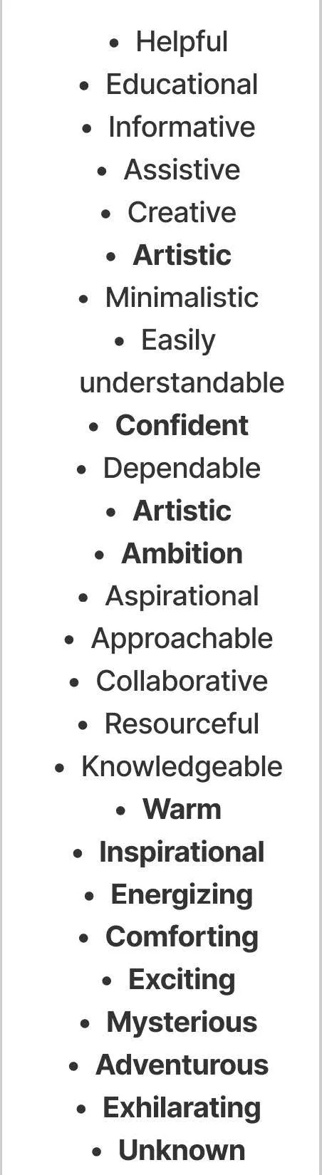 This list encompasses all of the adjectives that I initially came up with that aligned with the brand in my mind. The bolded adjectives were the ones that aligned best, and so I used the bolded adjectives to help brainstorm the rest of the brand assets.